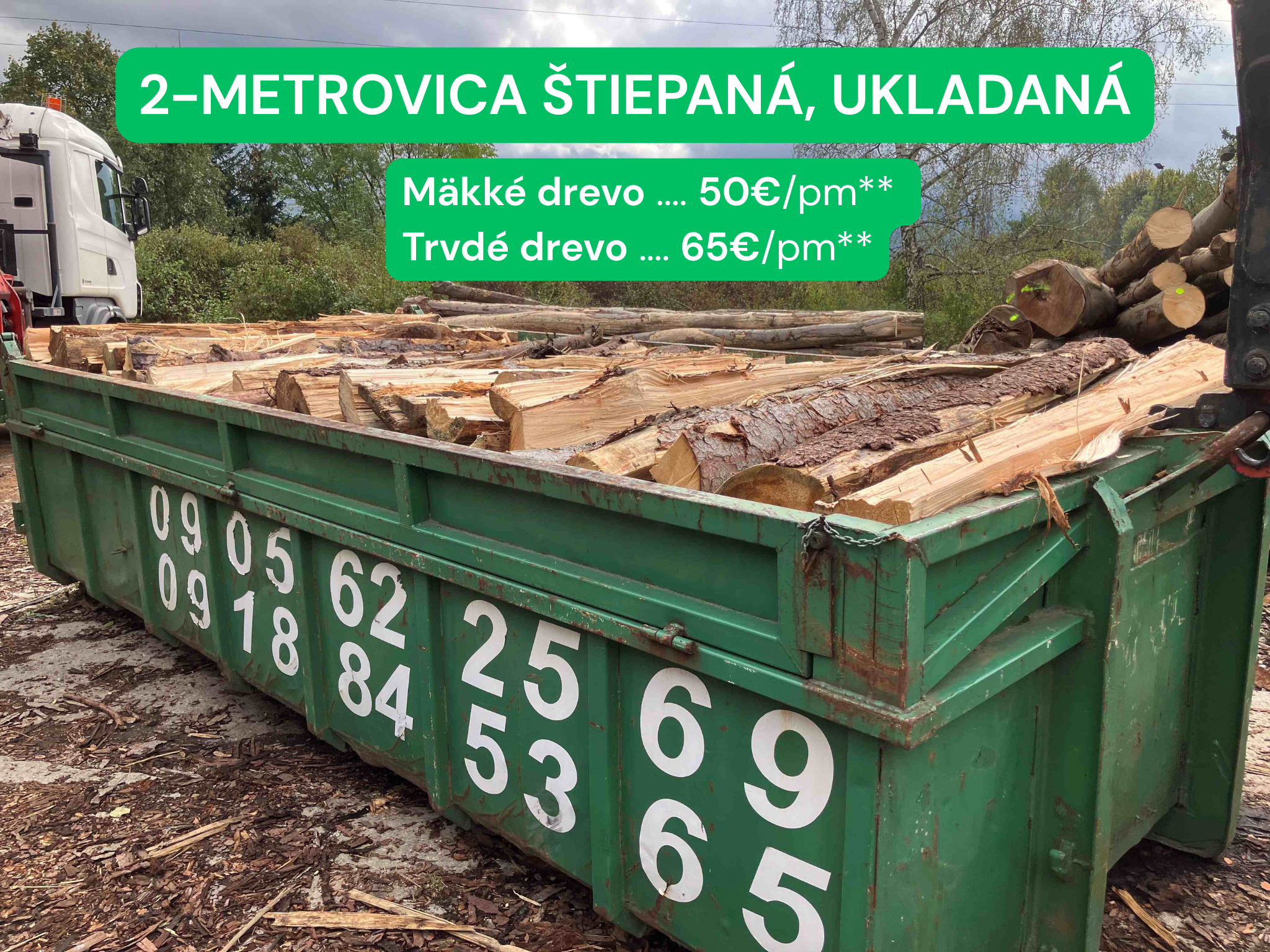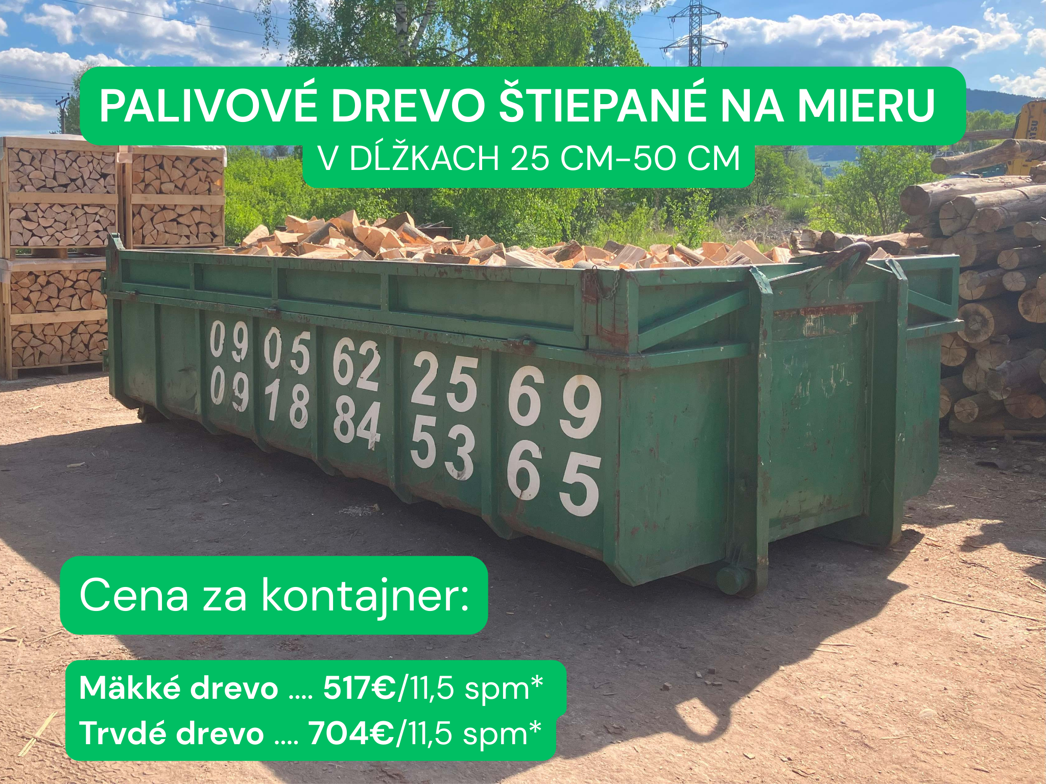 Palivové drevo na mieru (napílené, naštiepané na mieru v kontajneri):